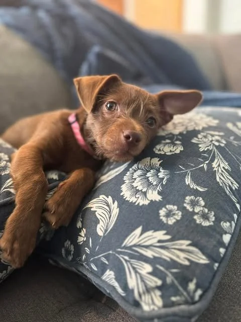 At just 3 months old and 7 pounds, this Chihuahua–Dachshund mix may be pint-sized, but she’s bursting with big dog energy and personality. Billie is incredibly playful and loves making friends wherever she goes — whether they’re big dogs, small dogs, cats, or kids. She truly hasn’t met anyone she doesn’t love!