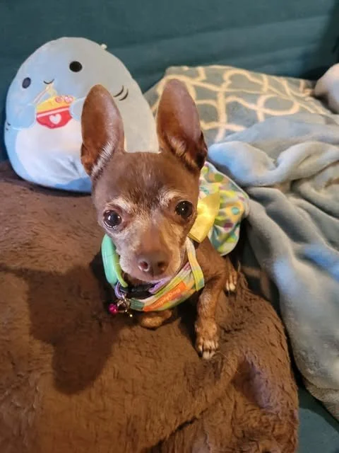 Delia is looking for a soft place to land where she can continue her "glow-up" journey. She needs a lap to curl up in, a few treats to sample, and a family that appreciates a resilient, waddling chocolate chihuahua. Is she your perfect match?