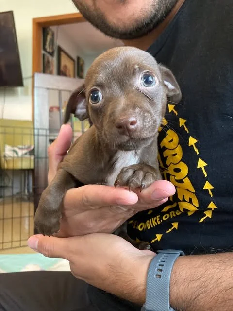 Kate is curious and shy, with a gorgeous chocolate coat and a snuggly, loving personality. Mom is chihuahua who weighs 13lbs, so we predict that she will be a small adult dog! She is adorably snuggly and will make a great forever family member.