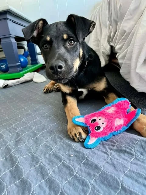 Lefou is a 4.5-month-old shepherd mix weighing 32 lbs, and he’s such a fun, happy puppy. He has that perfect combination of playful energy and sweet affection that makes this age so special. Lefou absolutely loves squeaky toys, stuffies, and chewing on bully sticks. He’s what we like to call a self-starter — if no one is available to play, he’ll happily toss his toys into the air and pounce on them all by himself for a full independent play session. He keeps himself entertained and it’s incredibly cute to watch.