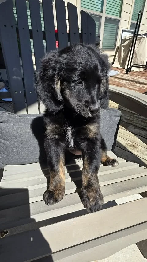 Maple is a delightfully sweet 11-week-old English Goldendoodle/Bernedoodle mix. She is a loving, active girl who loves to play and find occasional mischief. She enjoys wrestling with her brother and hanging out in the backyard playing.