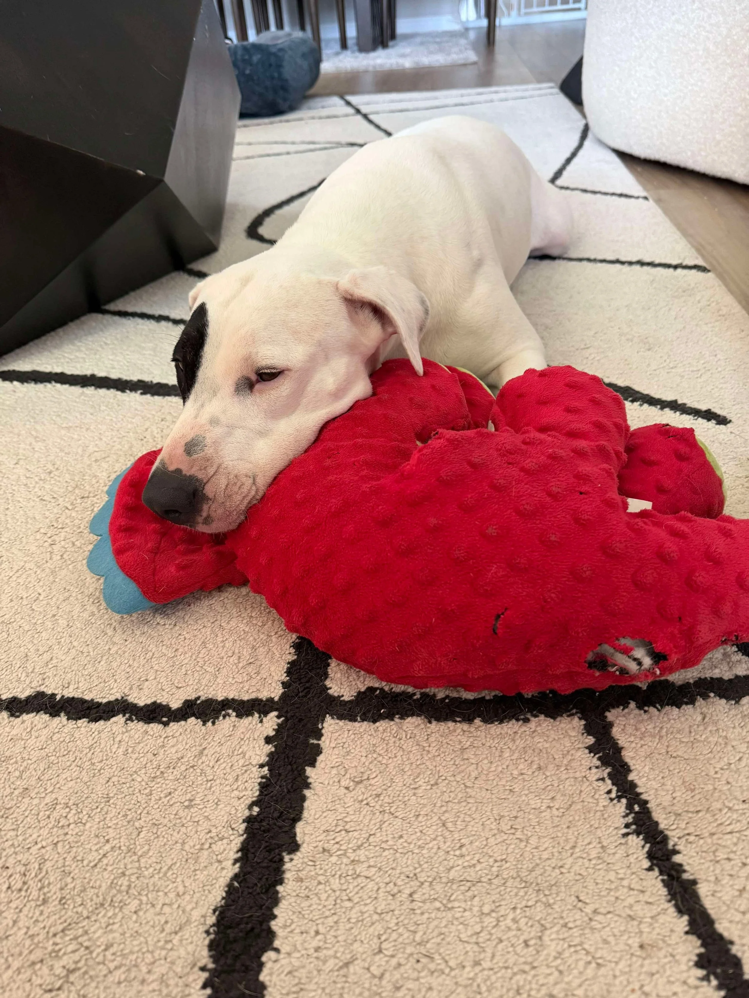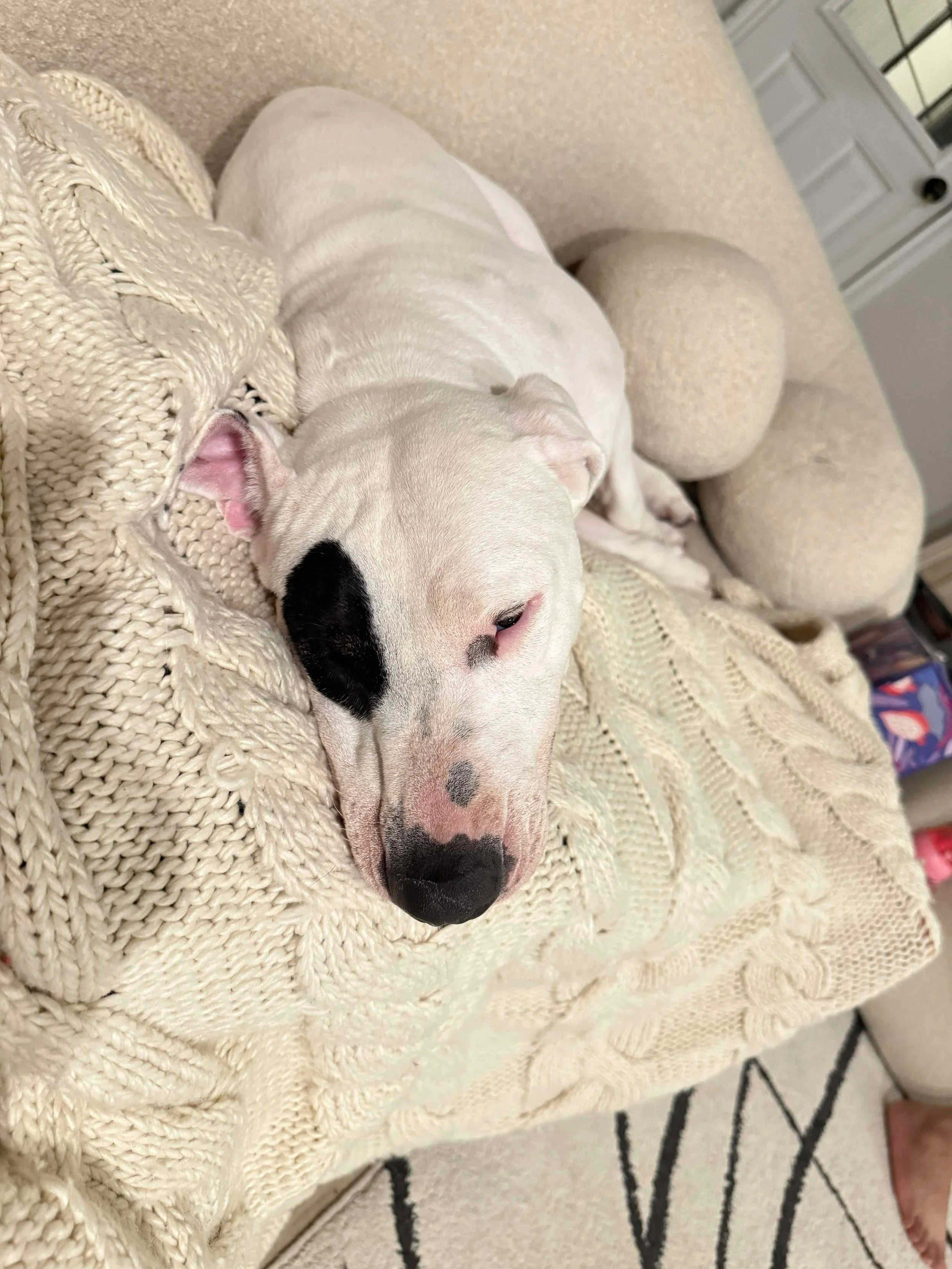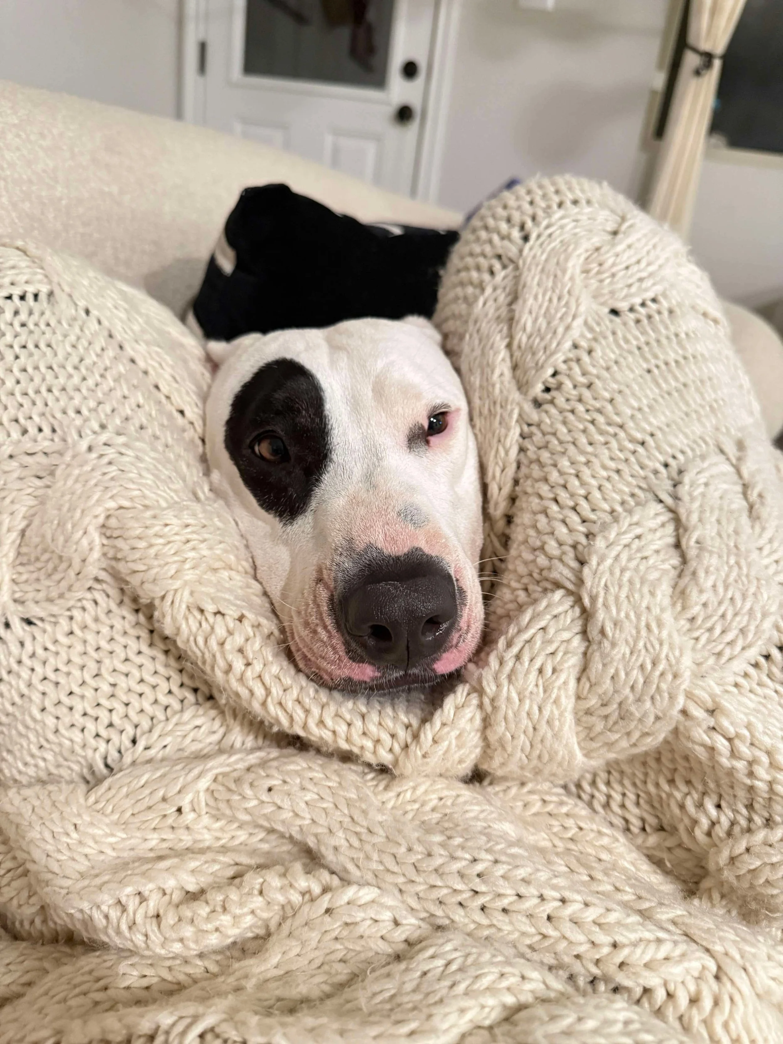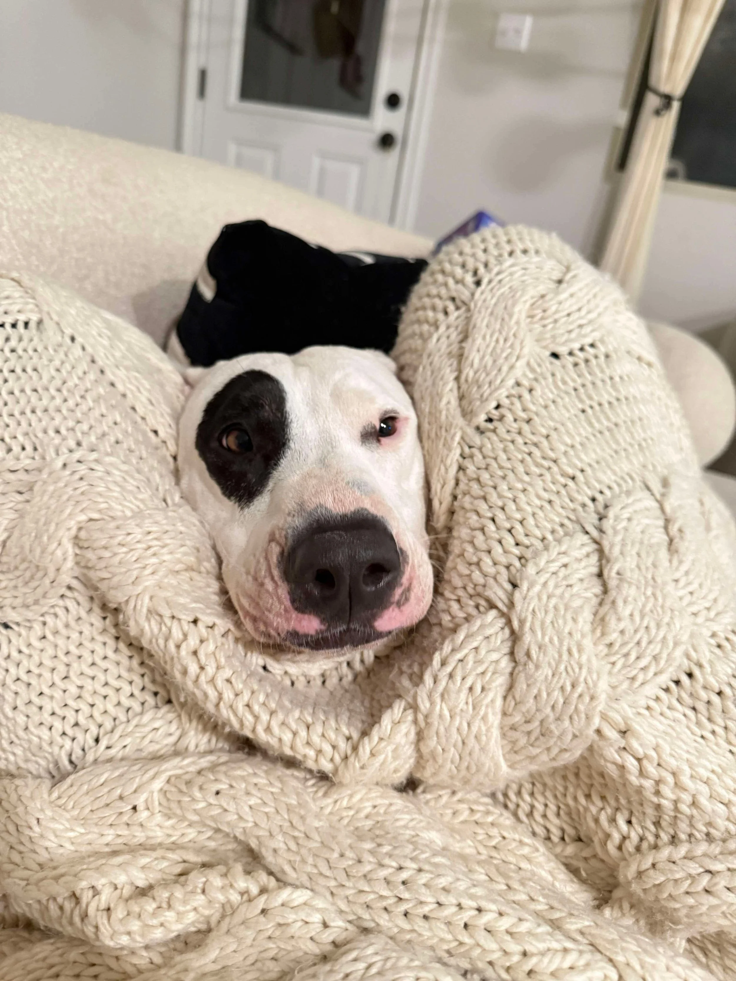 Patch is a pittie mix who weighs 47lbs and is 3 years old. She is looking for a loving family with whom she can play, snuggle, and love forever.