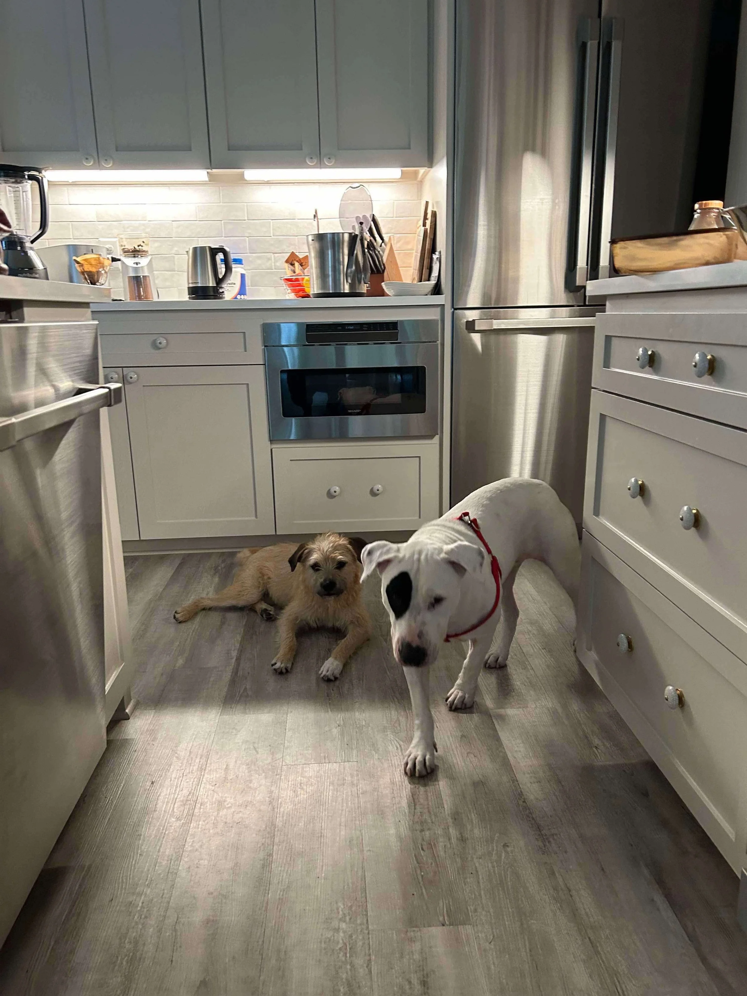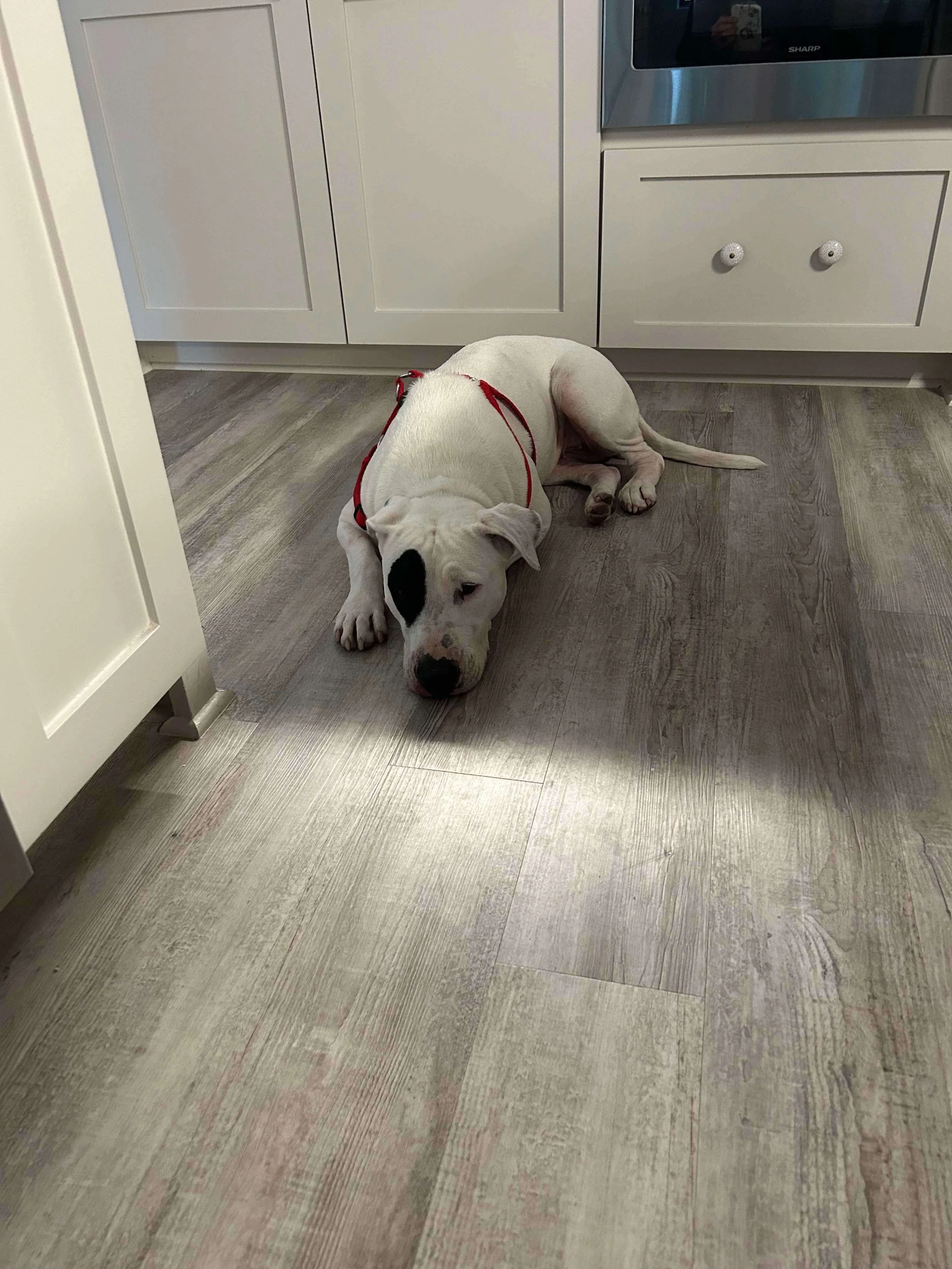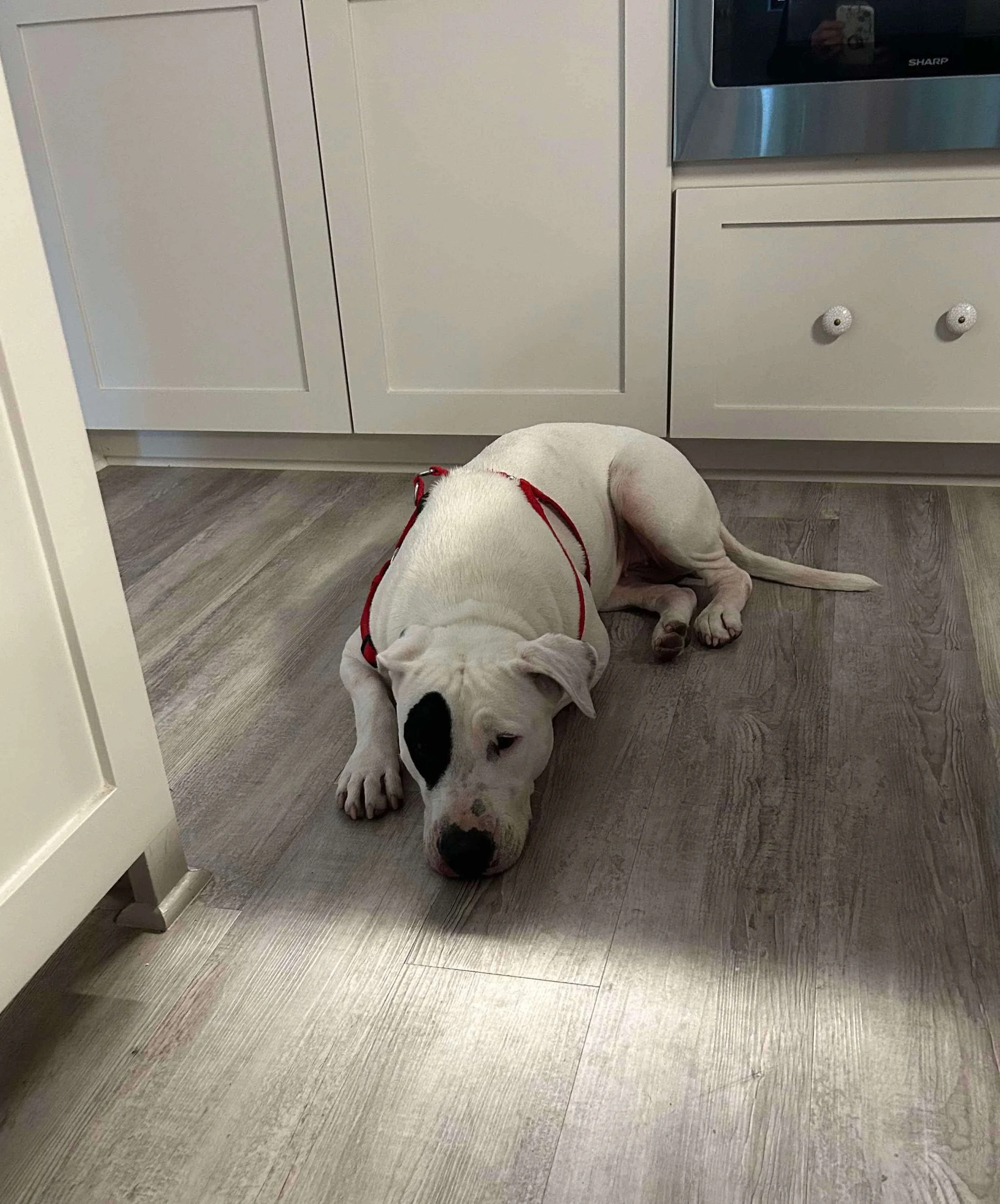 Patch is a very smart and trainable girl. She gives her full attention to her humans when they talk to her, and she is very eager to please. She is completely potty trained and uses the dog door with no issues! She learned sit in just a few minutes, and she sleeps in her own room all night long.
