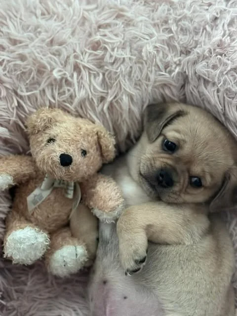 Mom is Shihtzu who weighs 13lbs, so we predict that she will be a small adult dog! She is adorably snuggly and will make a great forever family member. V